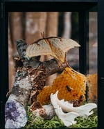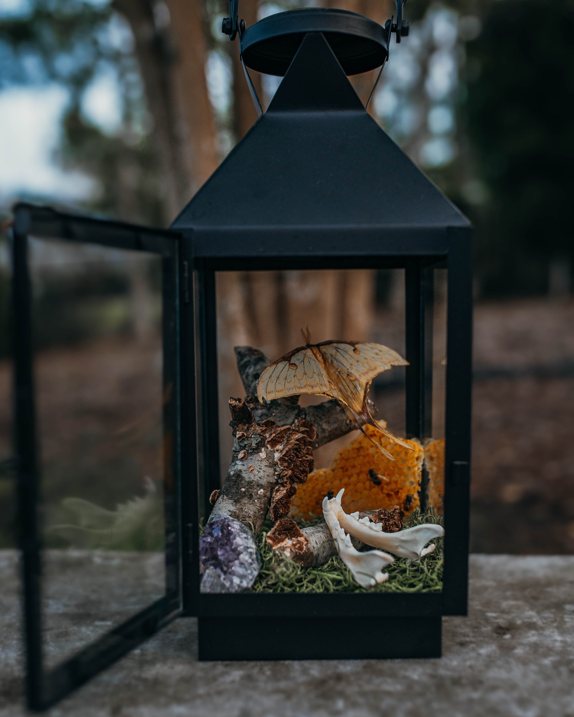 Lantern featuring Chinese Moon Moth, Cat jaw, Amethyst crystal, Honeycomb, and Turkey tail mushrooms