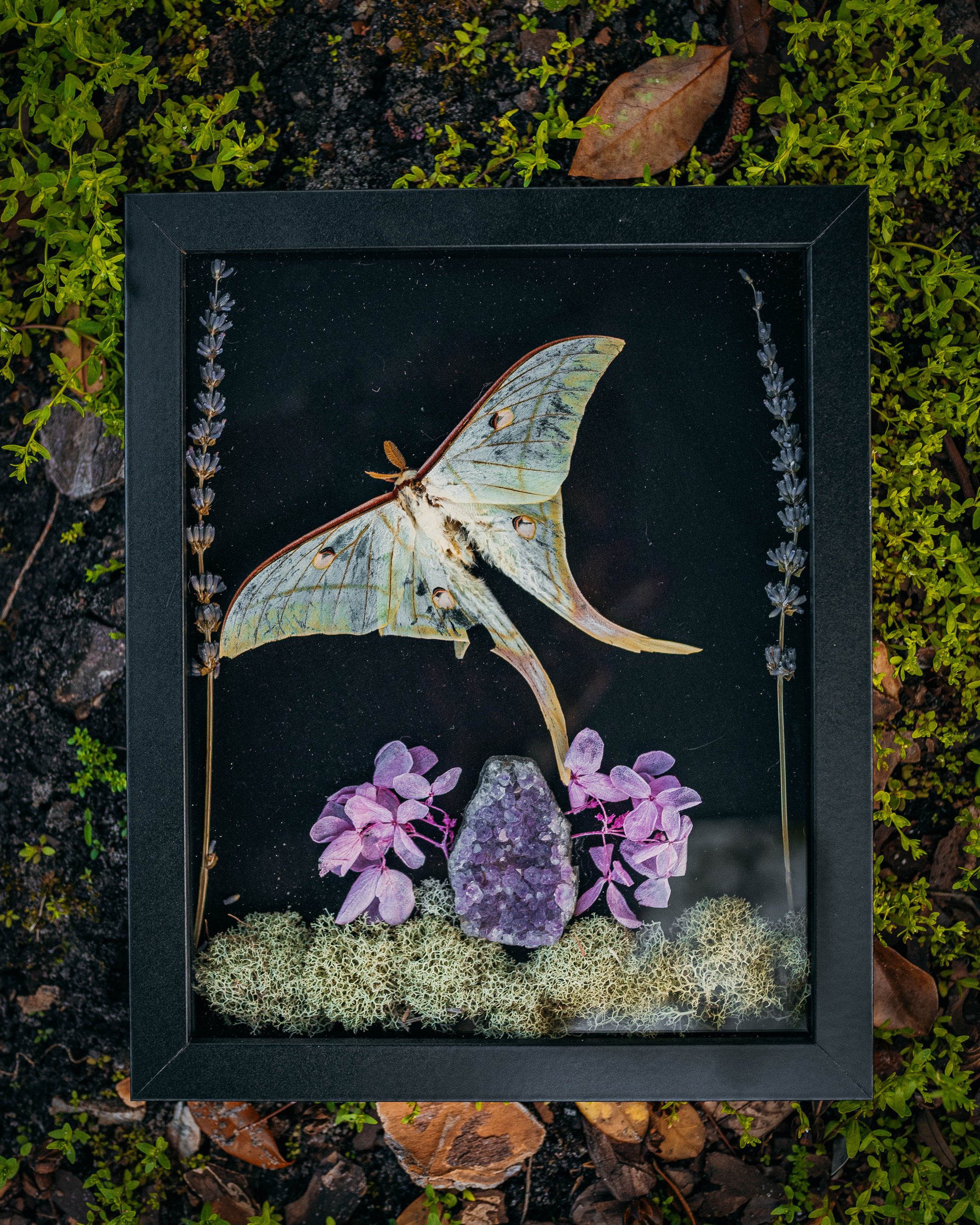 8 x 10 shadowbox featuring a Luna Moth, Amethyst crystal, Lichen, and florals