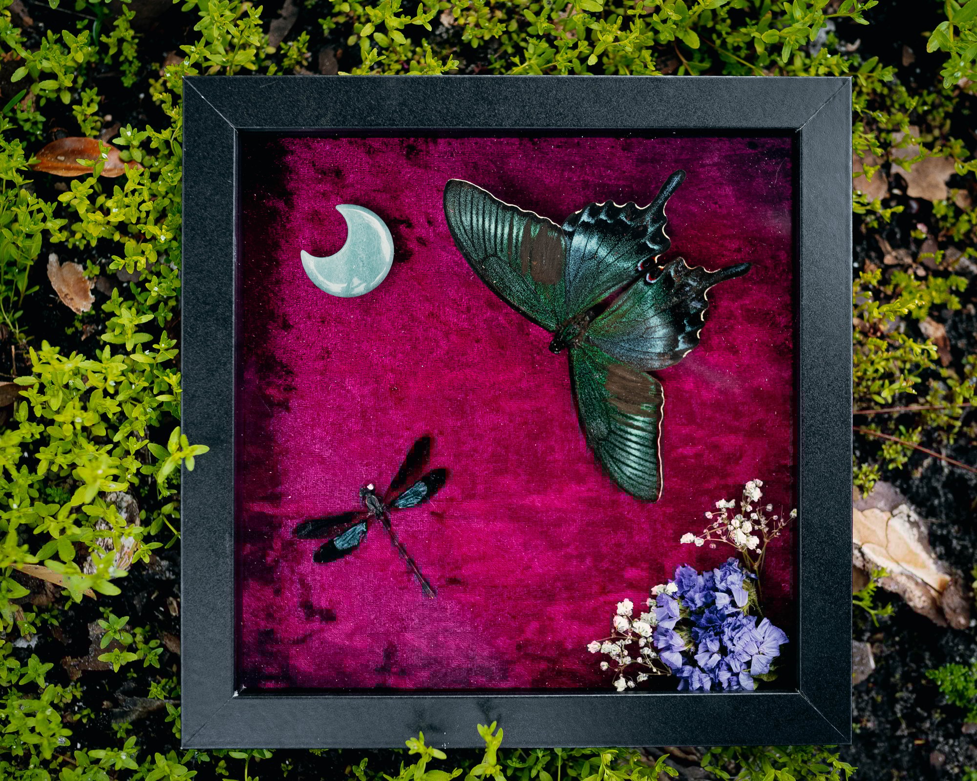 8 x 8 shadowbox featuring a Papilio Butterfly, Teal Damselfly, a Green Adventurine crystal moon, & florals